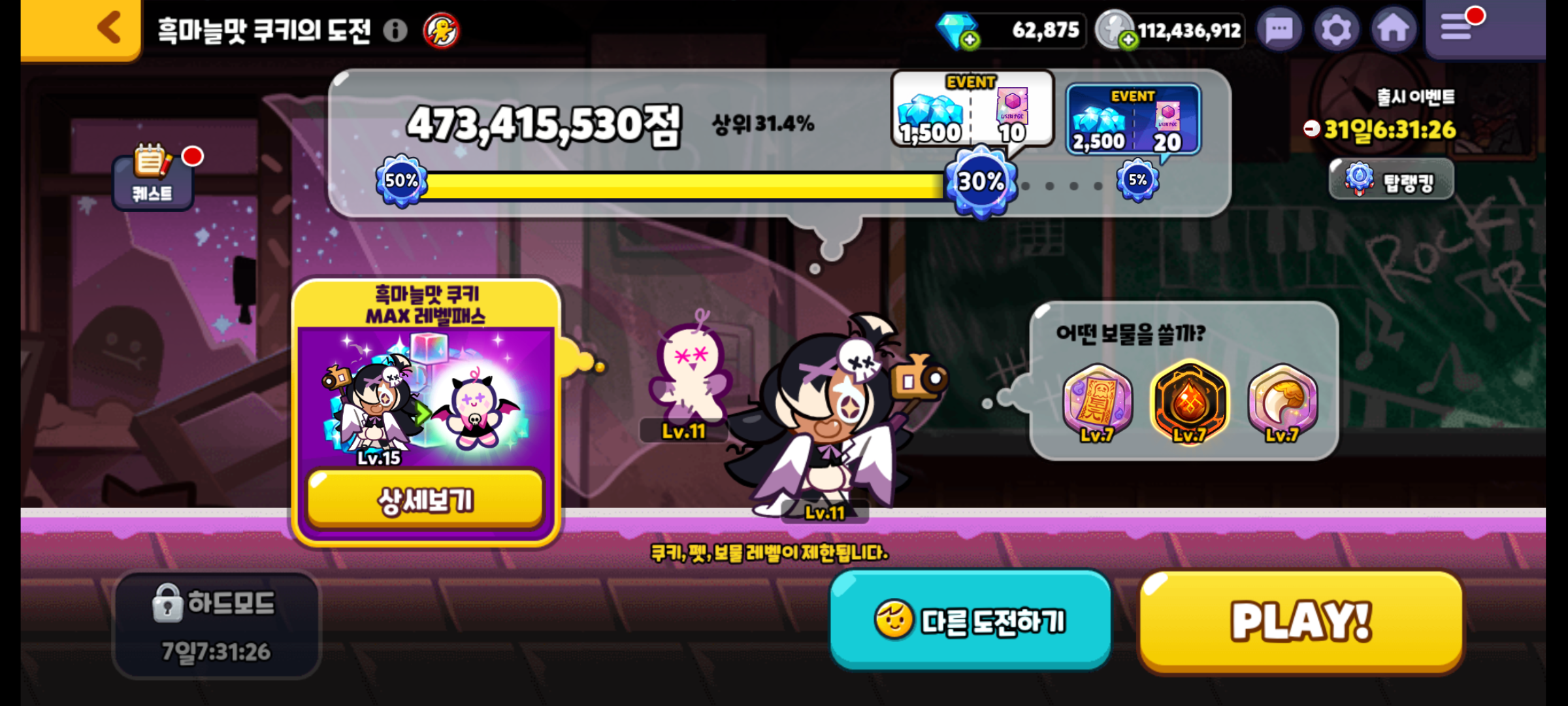 오늘 이렇게 흑마늘맛 쿠키의 도전 노멀모드 플레이해보는 시간을 가져봤습니다.