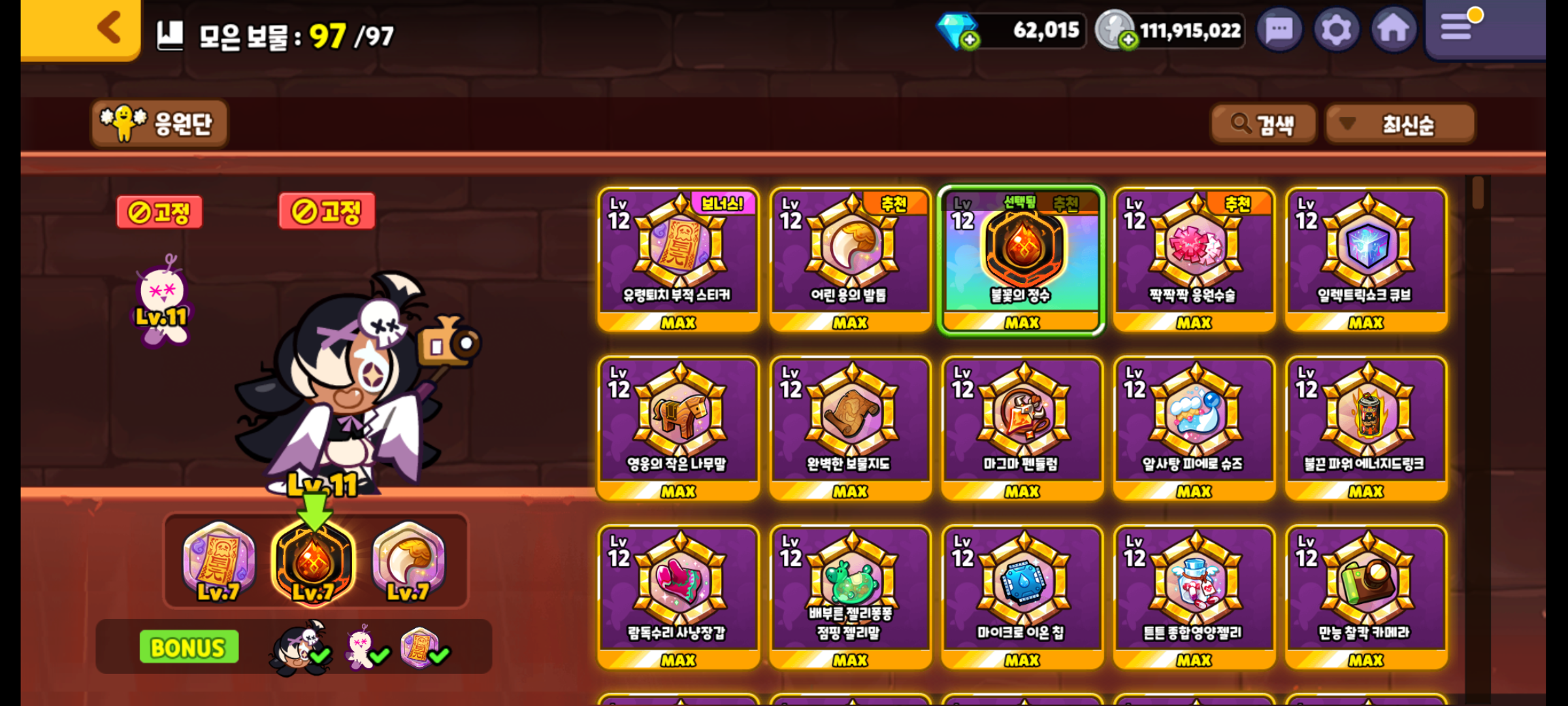 보물은 위와 같이 맞췄습니다. 유령퇴치 부적 스티커, 불꽃의 정수, 어린 용의 발톱 보물을 장착하였습니다.