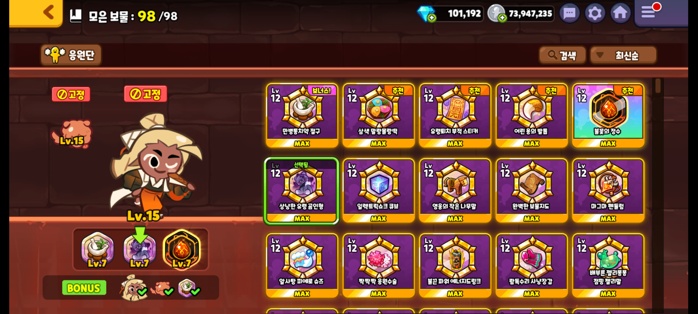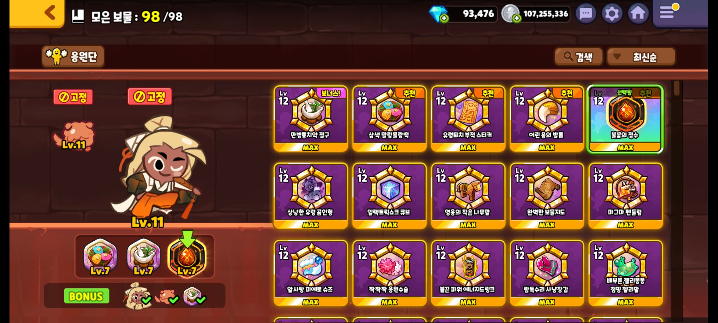 만병통치약 절구, 상냥한 유령 곰인형, 불꽃의 정수 보물을 장착하였습니다.