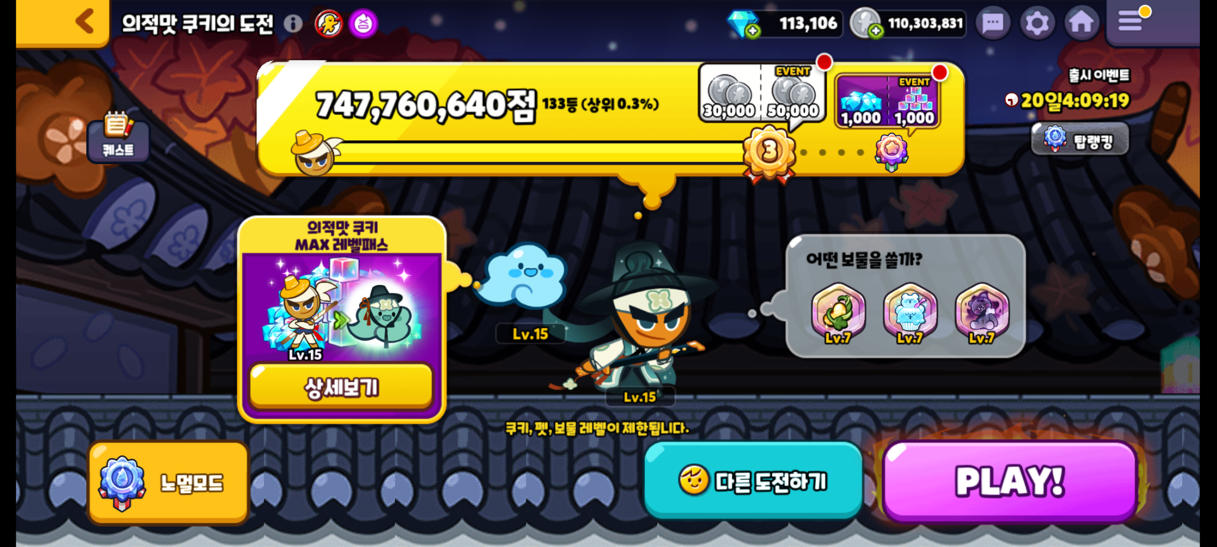 다만, 의적맛 쿠키의 도전 노멀모드는 등수가 더 떨어질 가능성이 있기에 상황 보다가 점수를 더 올려놓던가 하겠습니다.