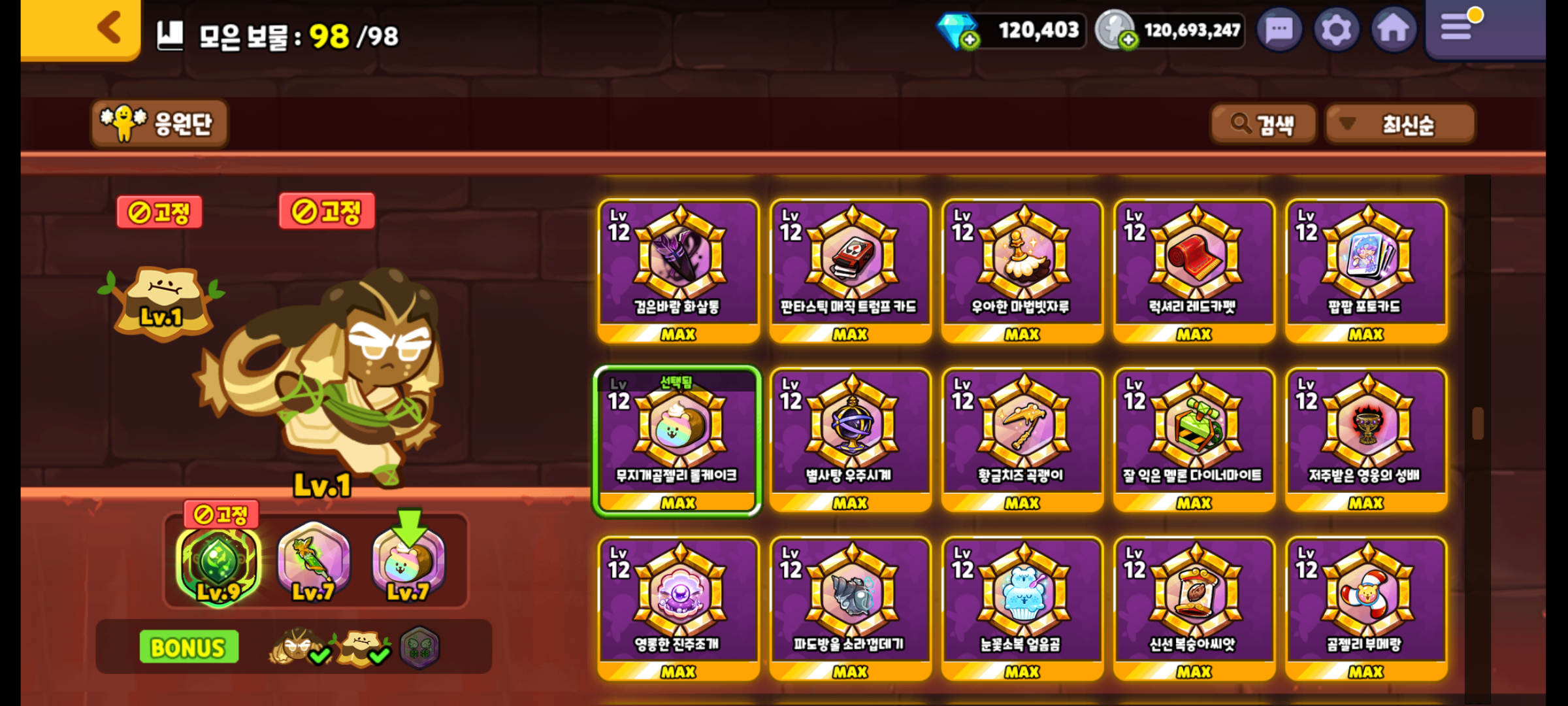 보물은 기적의 초록 나무영양제, 무지개곰젤리 롤케이크 보물을 장착하였습니다.