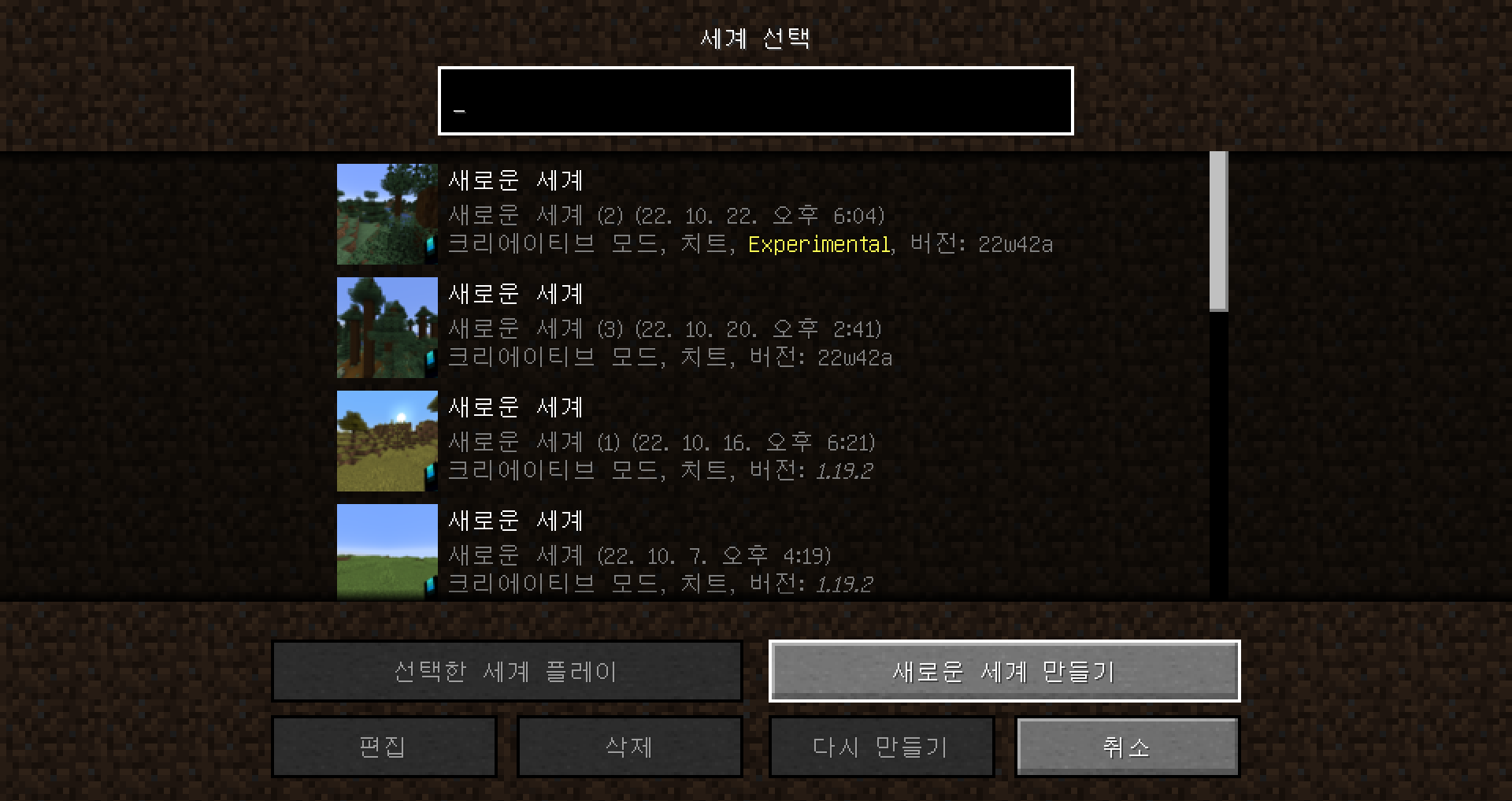 - 실험적 기능을 사용하는 세계는 세계 선택 목록에서 "Experimental"으로 표시됩니다.