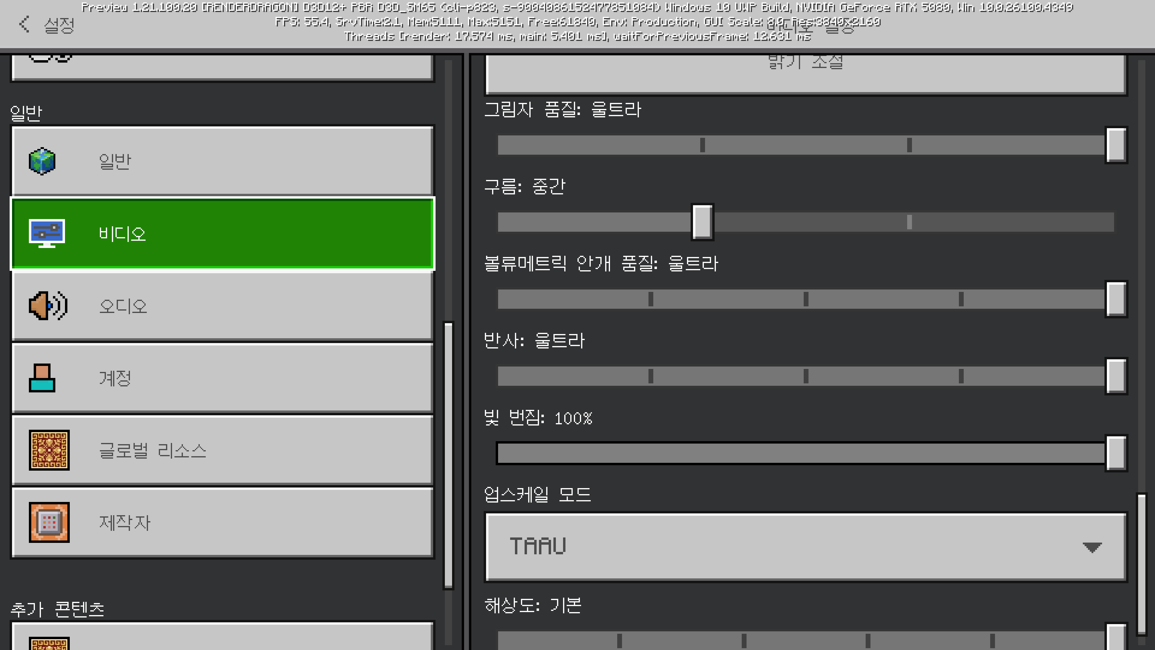 비디오 설정에서 그래픽 모드를 선명한 비주얼로 바꾸시면 됩니다. 성능 선호는 옵션을 낮춰서 프레임이 올라갈 수 있도록, 시각 선호는 그런 것 상관 없이 옵션 높여서 퀄리티에 중점을 둔 프리셋이라고 보면 됩니다.