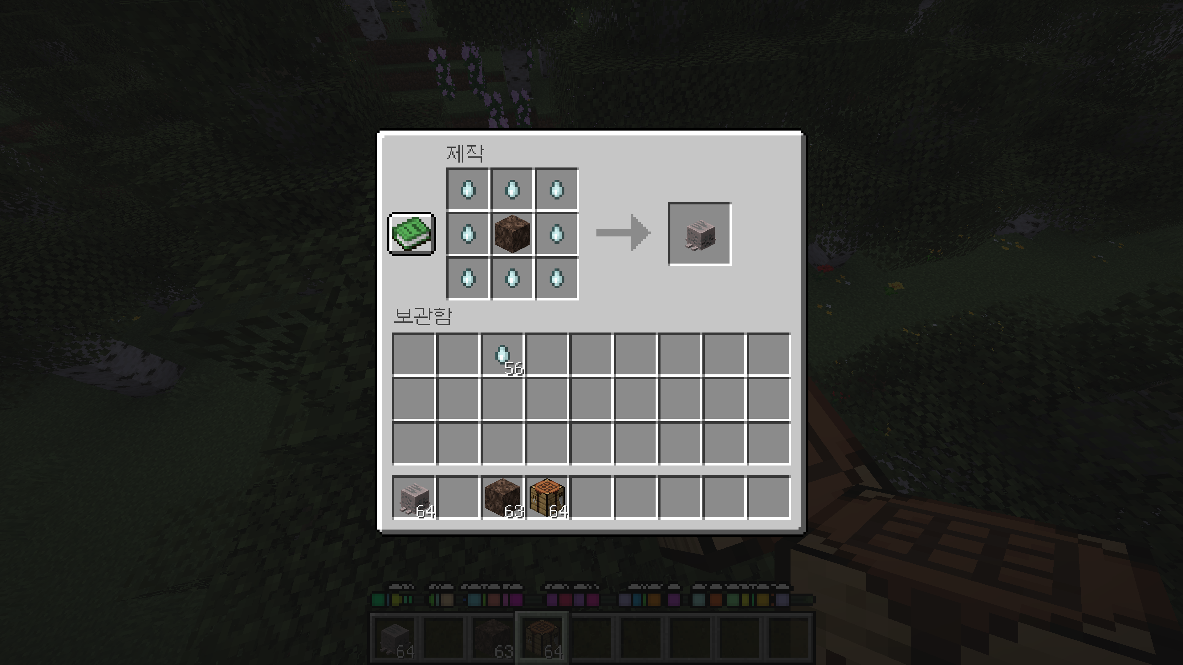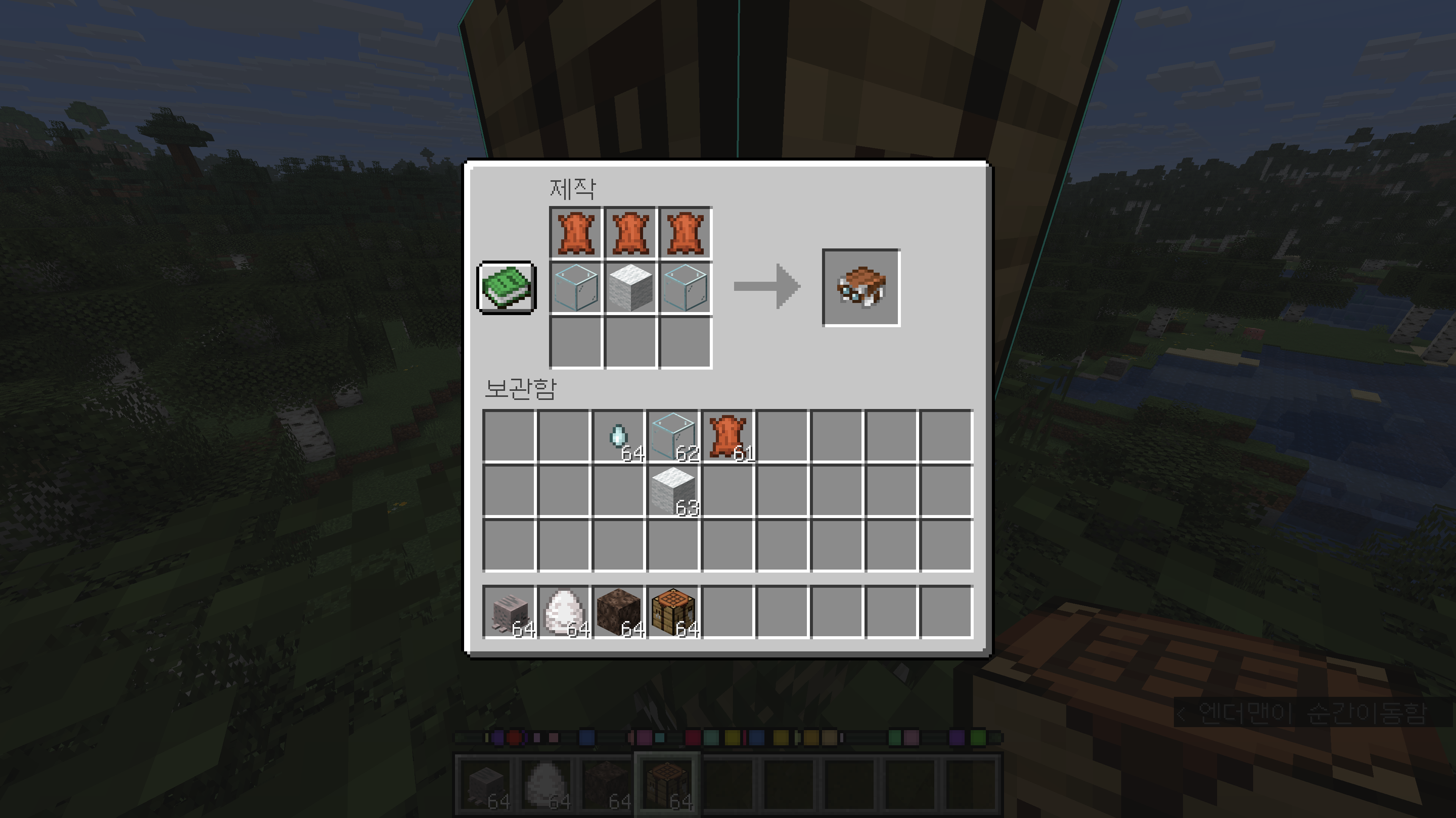그리고 하네스라는 새로운 아이템이 생겼습니다. 가죽 3개, 유리 블록 2개, 양털 블록 하나로 조합 가능합니다. 가운데 다른 색상의 양털을 사용함으로서 다른 색상의 하네스를 조합하실 수도 있습니다.
