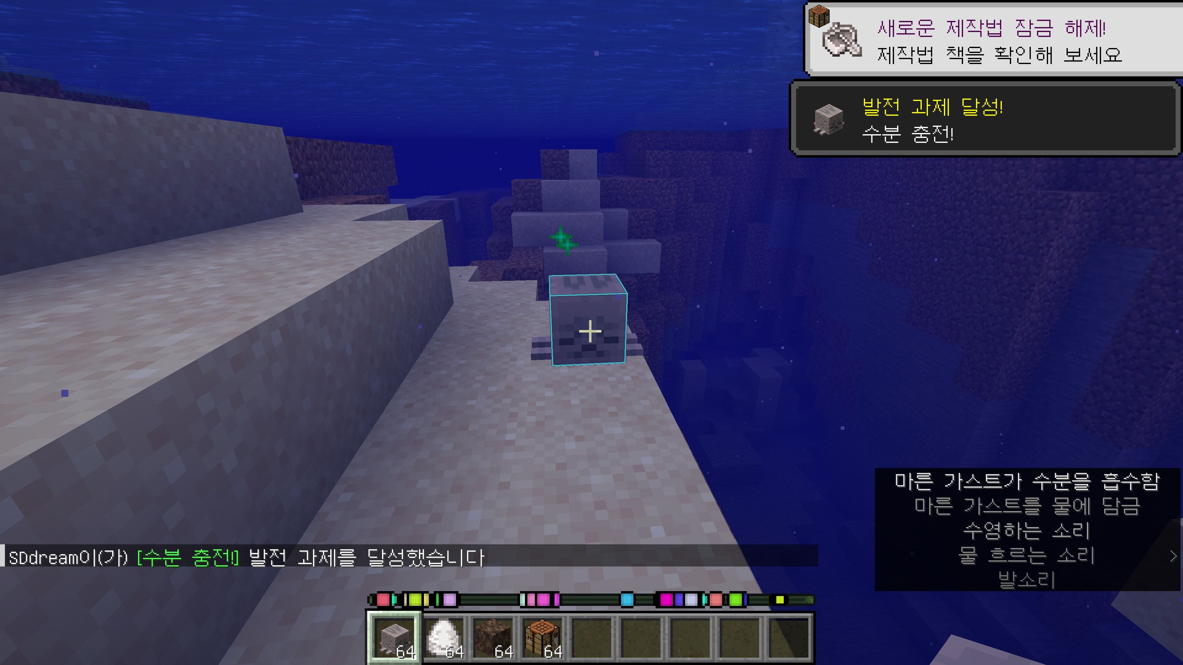 그리고 새로운 발전 과제가 추가되었습니다. 위에서도 소개시켜드린 마른 가스트를 물 속에 설치하면 달성되는 수분 충전!과 크리킹 심장을 위와같이 창백한 참나무 원목 사이에 설치하면 달성되는 심장 이식 수술 발전과제가 추가되었습니다.