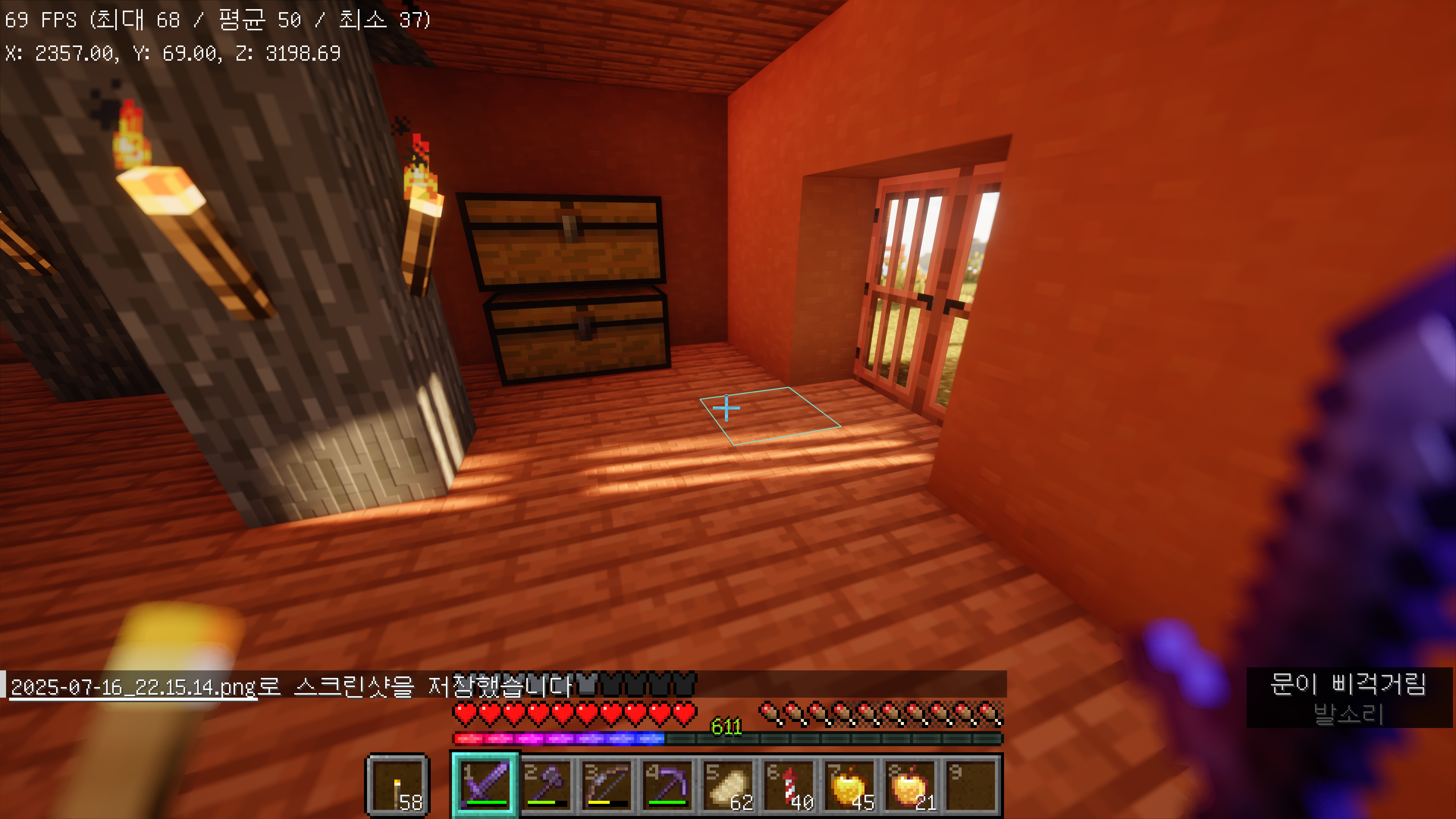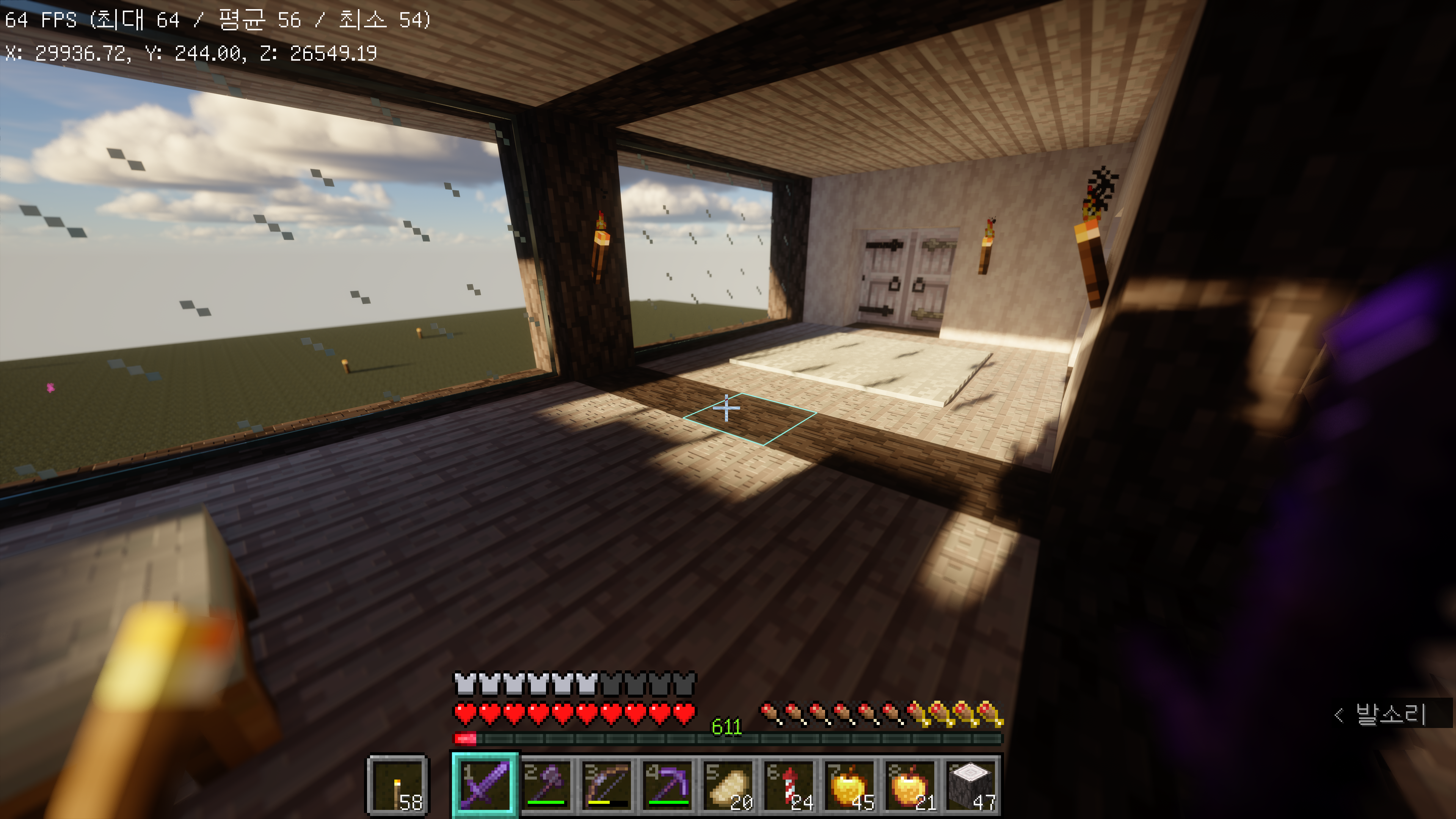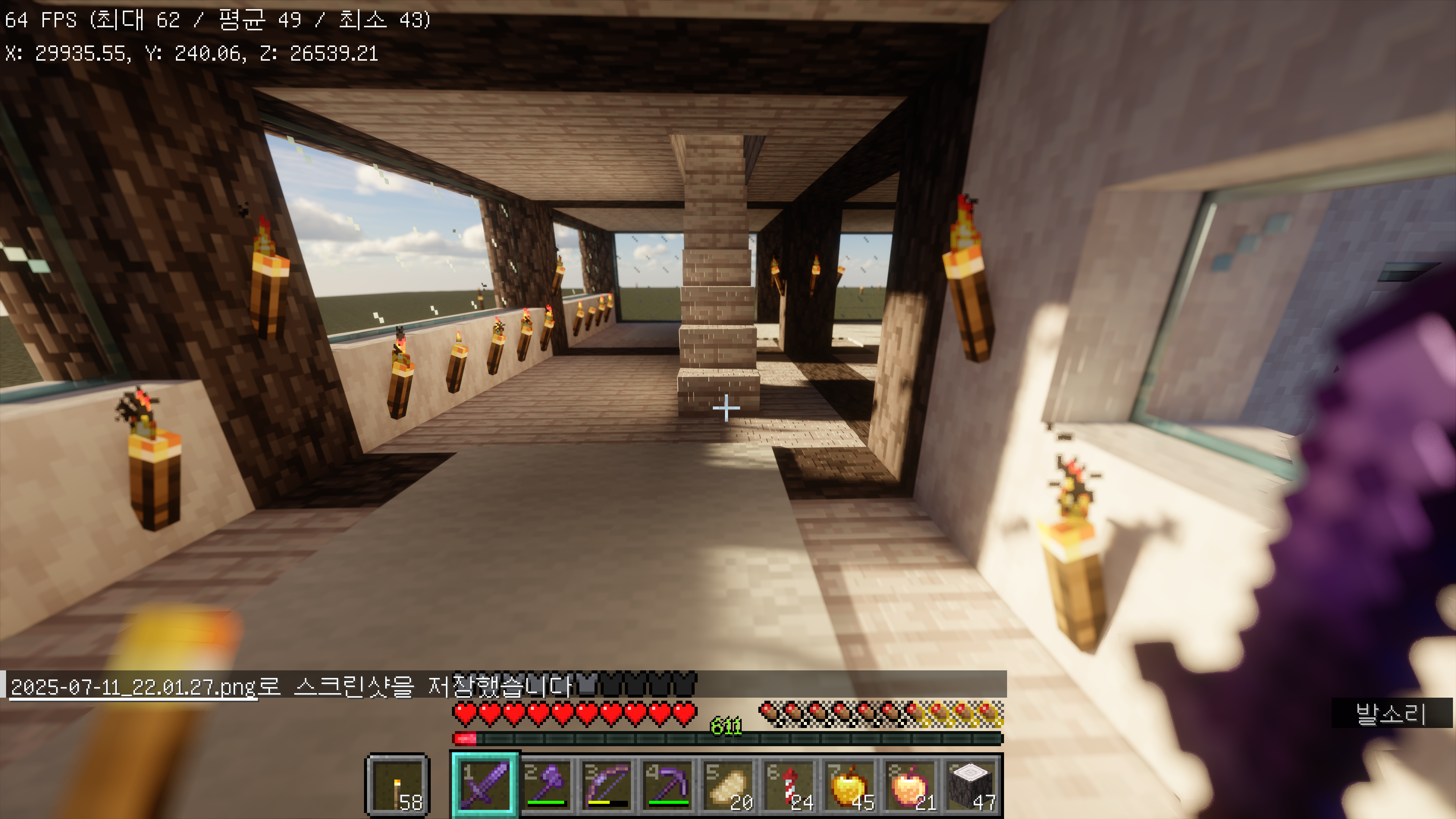 AVPBR 리소스팩도 같이 사용중에 있는데 호환이 되는 모습을 보여주고 있습니다. 태양의 위치에 따라 건물 내부에 들어오는 햇빛에도 영향을 주는 모습입니다.