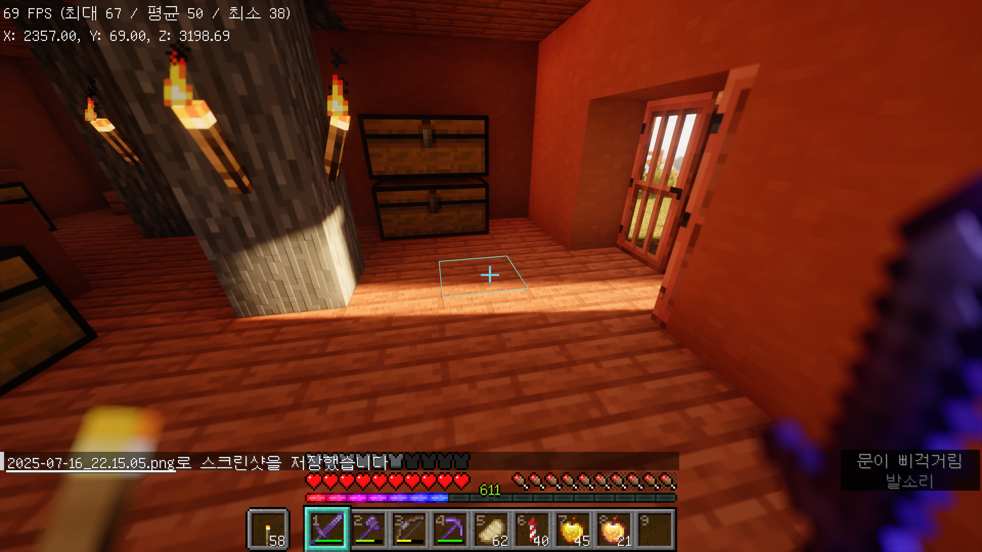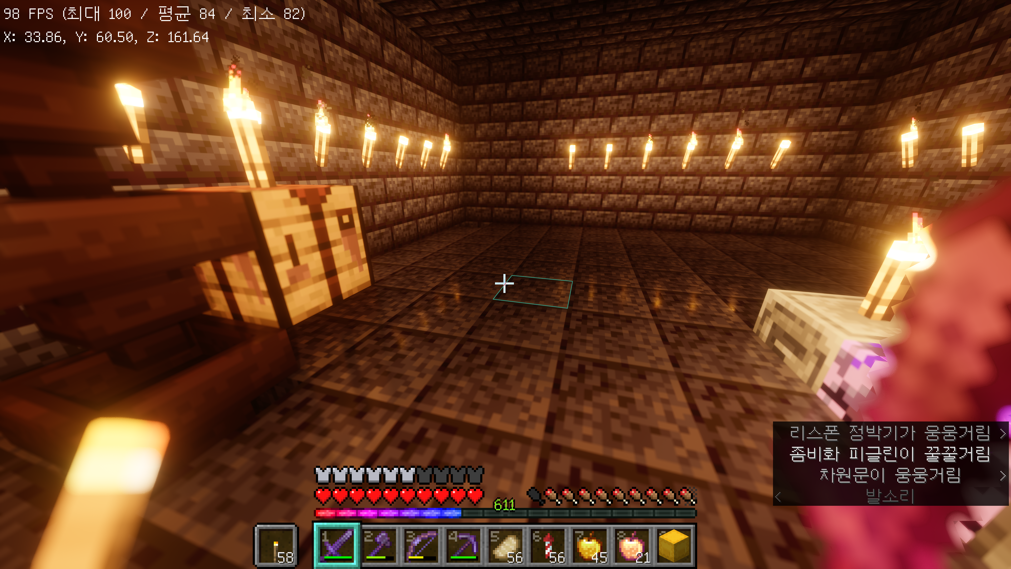네더에서는 이런 모습입니다. bloom 효과도 잘 적용이 되는 모습입니다. 그리고 이 쉐이더도 반사를 지원합니다. 오른쪽에 보시면 벽에 설치된 횃불이 바닥표면에 반사가 되는 모습입니다.