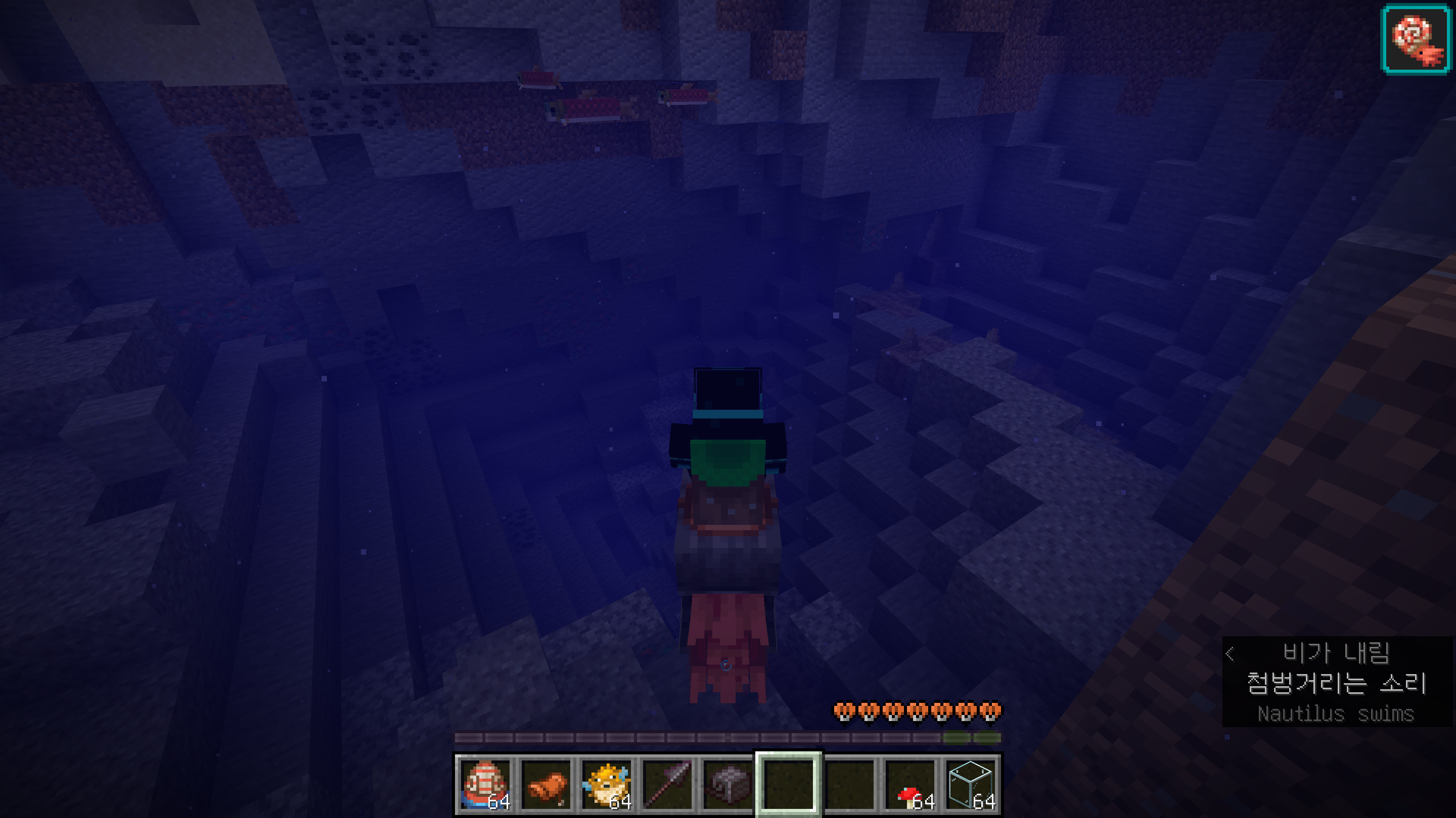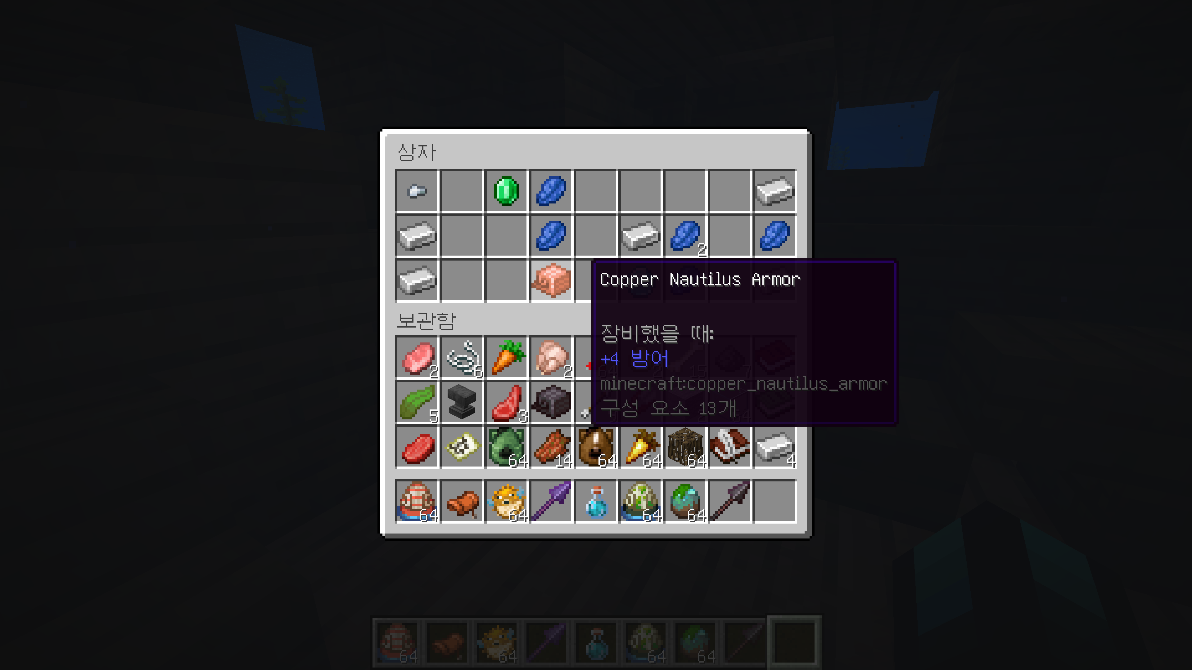 그나저나 좀비 앵무조개는 크게 문제가 되지 않을 수도 있는데 맹점은 앵무조개가 이미 로드된 청크에서도 스폰하냐는 것이 중요한 건데요. 만약 그렇지 않는다면 제가 거의 6년동안 한 야생맵에서 앵무조개 데려오는 것도 고역이 될 전망입니다. 일반적인 동물이라면 네더 천장을 이용하면 되겠지만 앵무조개는 수상몹이라서 그게 불가능 할 거라서요..