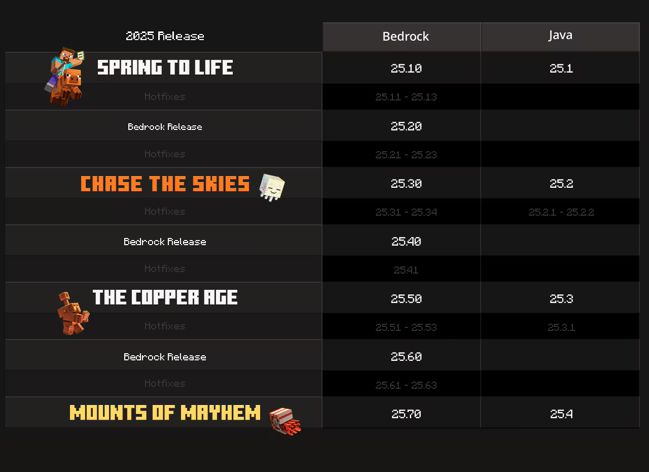 2025년을 기준으로 한 예시를 들어보겠습니다. 2025년에는 세 개의 게임 업데이트(생명의 봄, 하늘을 쫓아서, 구리 시대)를 출시했으며, 한 번 더 출시 예정인 탈것의 광란이 있습니다! 2025년을 예시로 새로운 버전 번호 체계를 적용해 보면, 베드락과 자바 에디션이 어디서 같고 어디서 다른지 더 잘 이해할 수 있습니다!