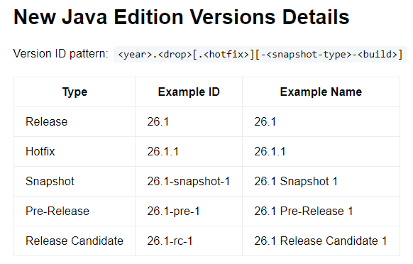 이제 베드락과 자바는 서로 다른 출시 주기를 따르므로 "26" 뒤에 오는 숫자는 달라질 것입니다. 여기에는 몇 가지 이유가 있습니다(예: 플랫폼 제한 사항, 그리고 베드락이 연중 더 빈번하게 출시된다는 점). 하지만 공통 접두사를 사용하면 제작자(와 플레이어)가 어떤 버전이 어떤 것인지 더 쉽게 알 수 있을 것입니다.