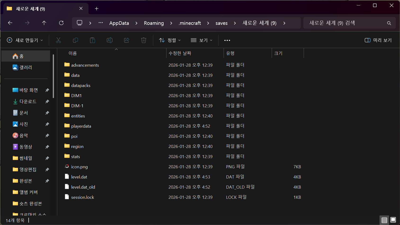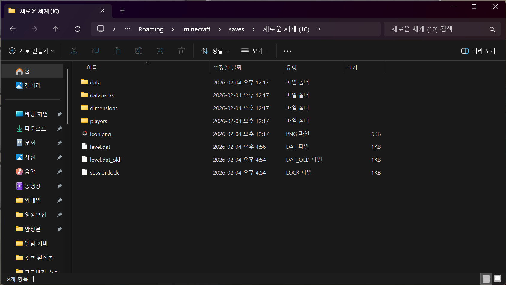 - 오버월드 데이터는 루트 폴더에서 dimensions/minecraft/overworld