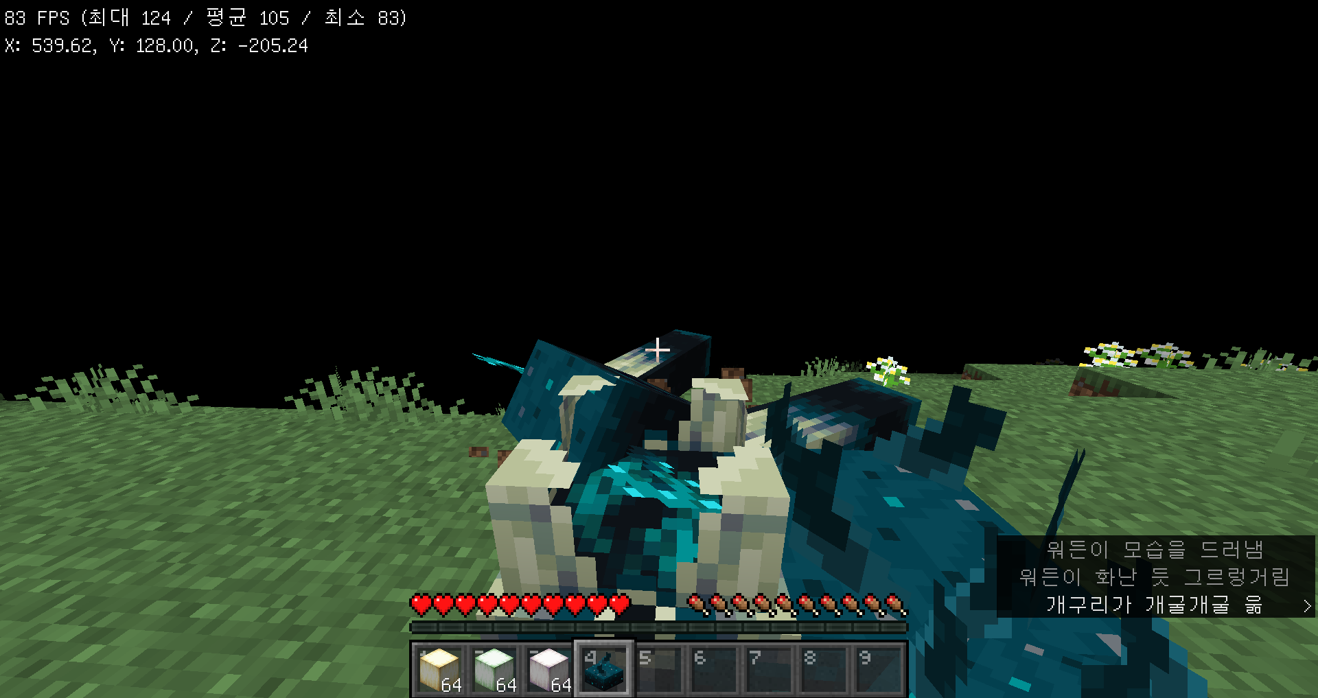 스컬크 비명체를 4번 작동시키면 땅 속에서 워든이 튀어나옵니다. 워든의 근접 공격력은 어마무시하며 심지어 공속까지 빠른 터라 네더라이트 풀셋으로도 얼마 못 버틸 정도입니다.
