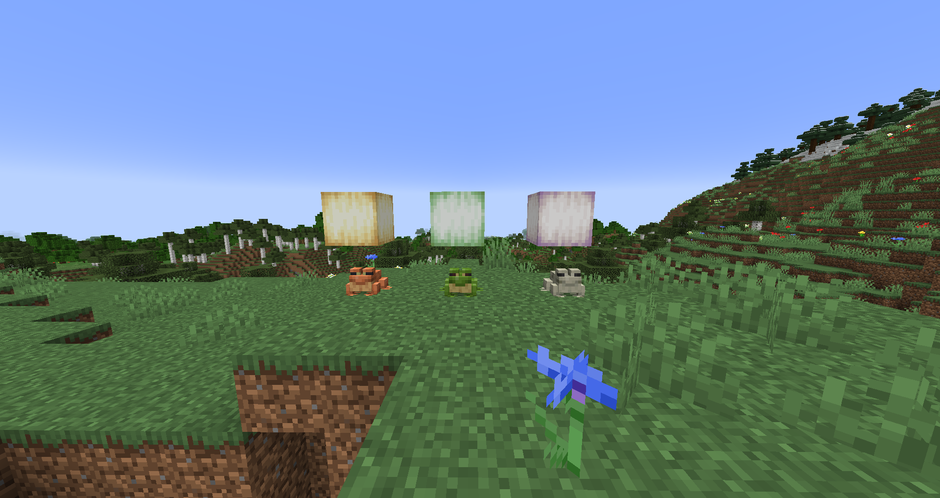 개구리가 추가되었습니다. 개구리는 일반적으로 주황색이지만 추운 바이옴에서 스폰되고 성장한 개구리는 초록색을 띄고, 더운 바이옴에서 스폰되고 성장한 개구리는 하얀색을 띱니다.