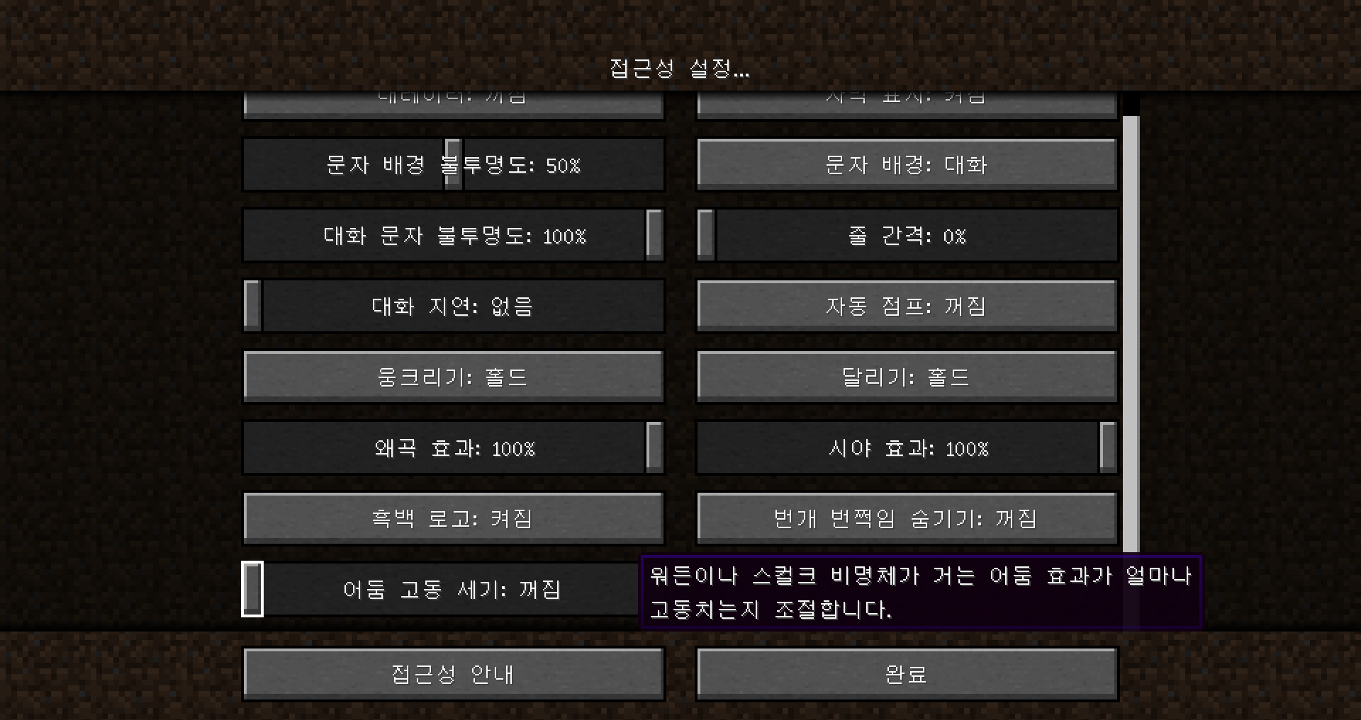 혹시 암흑 효과가 거슬리시다면 접근성 설정에서 어둠 고동 세기를 낮추시면 됩니다. 저 같은 경우에는 꺼짐으로 해놓은 상태입니다.