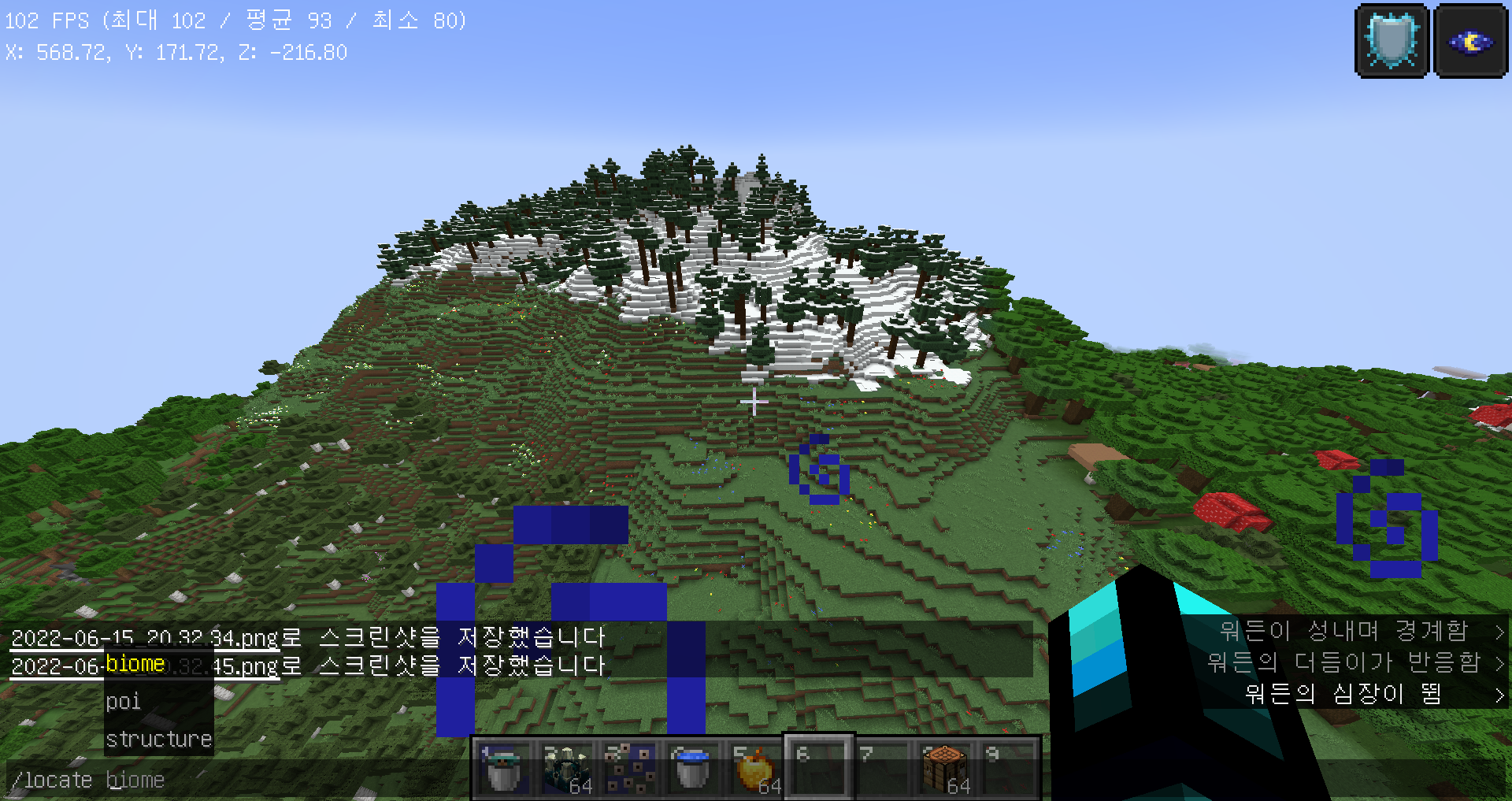 위와 같이 locate명령어가 세분화되었습니다. biome은 기존 /locatebiome이랑 똑같은 명령어이고 structure는 기존 /locate 명령어와 똑같은 명령어입니다.