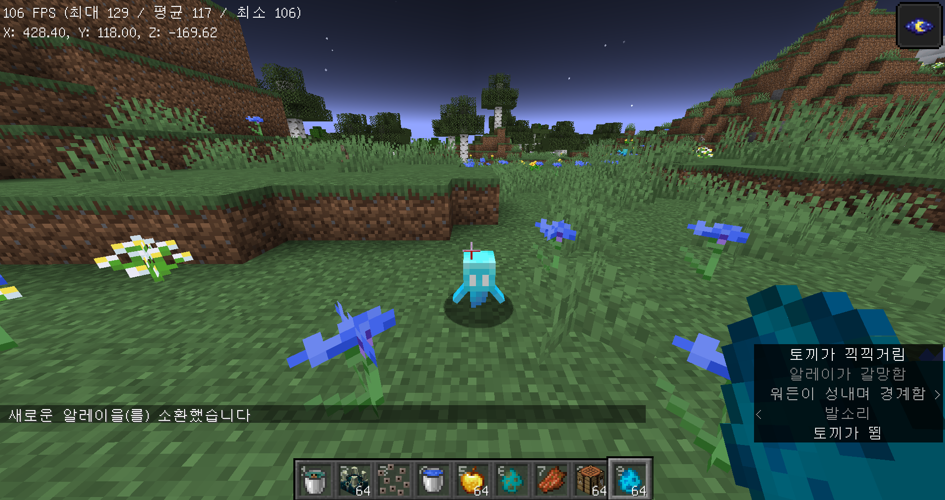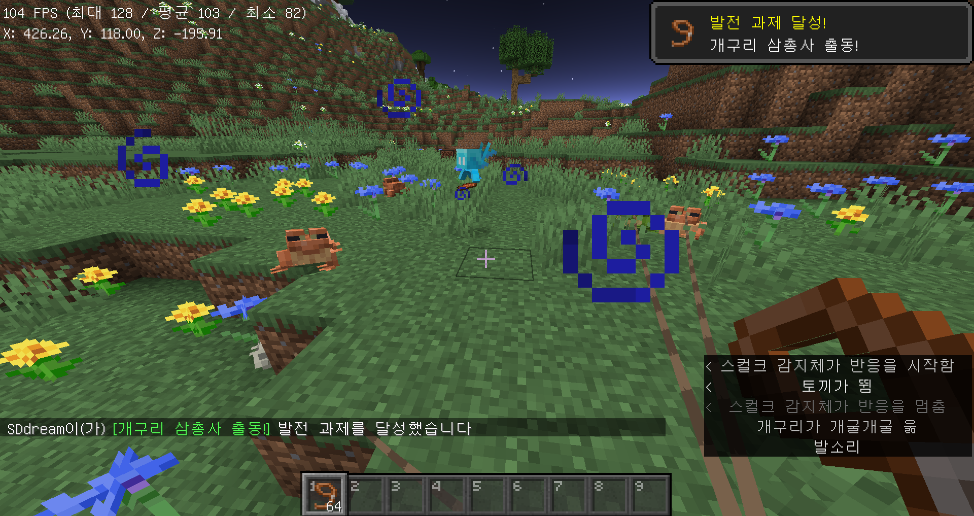 마인크래프트 1.19 업데이트 정리 2편: 개구리, 올챙이, 워든 목차 1. 리뷰 영상 2. 인사말 3. 개구리&올챙이 4. 워든&암흑 효과 5. 염소뿔 6. 마무리 1. 리뷰 영상 2. 인사말 안녕하세요 에쓰디드림입니