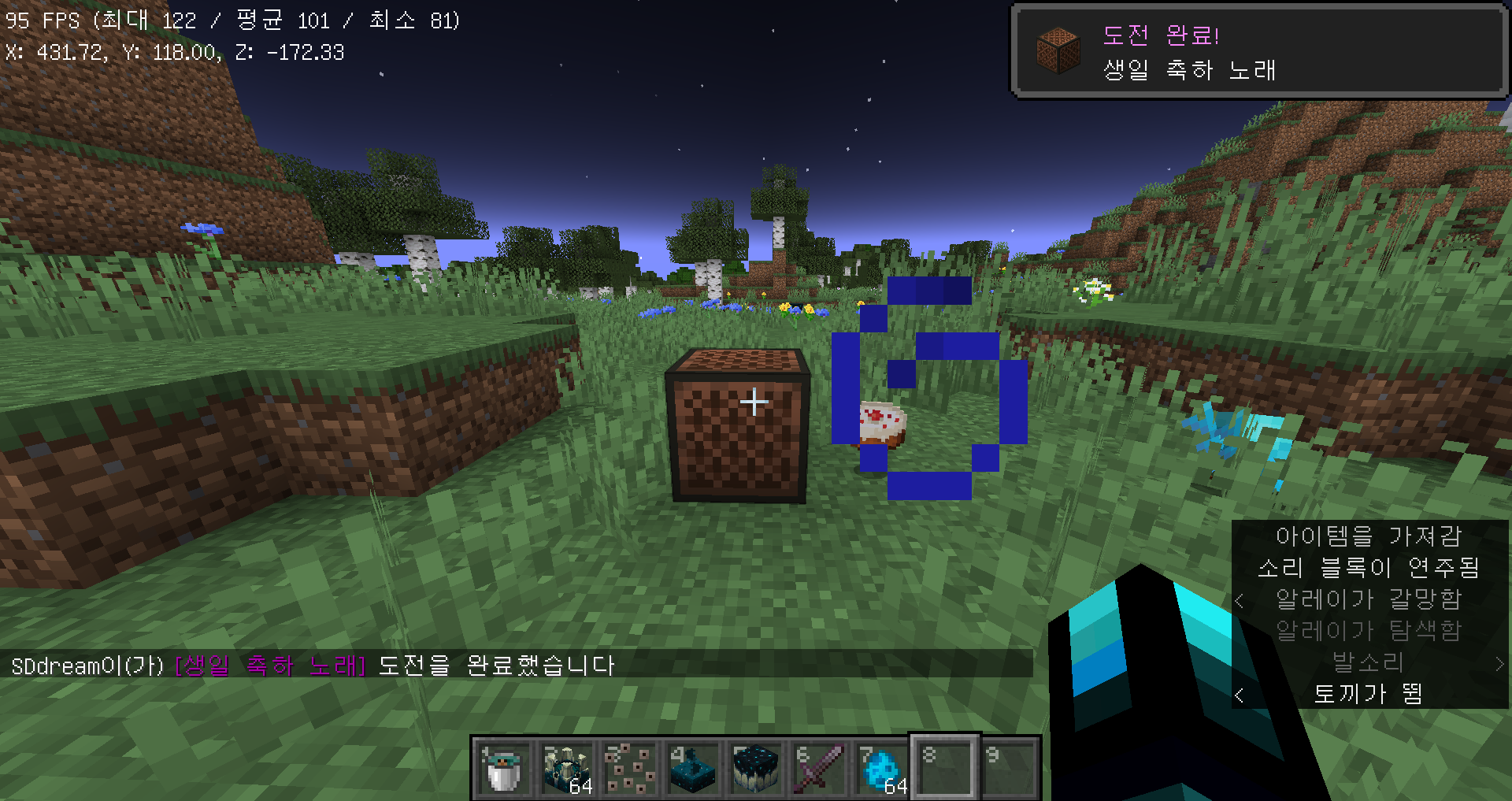 알레이가 케이크를 소리 블록에 떨어뜨리게 하면 생일 축하 노래 발전과제를 달성하실 수 있습니다.