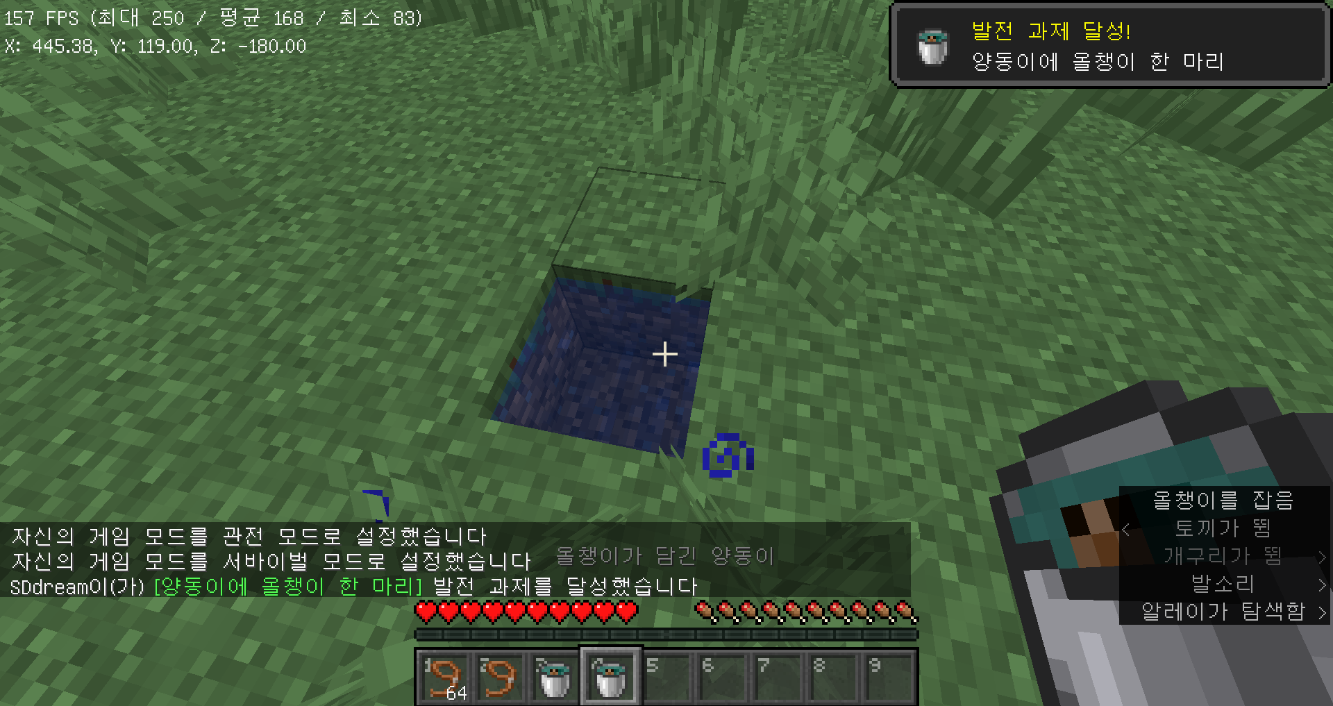 올챙이를 물양동이로 담으면 양동이에 올챙이 한 마리 발전과제를 달성하실 수 있습니다.