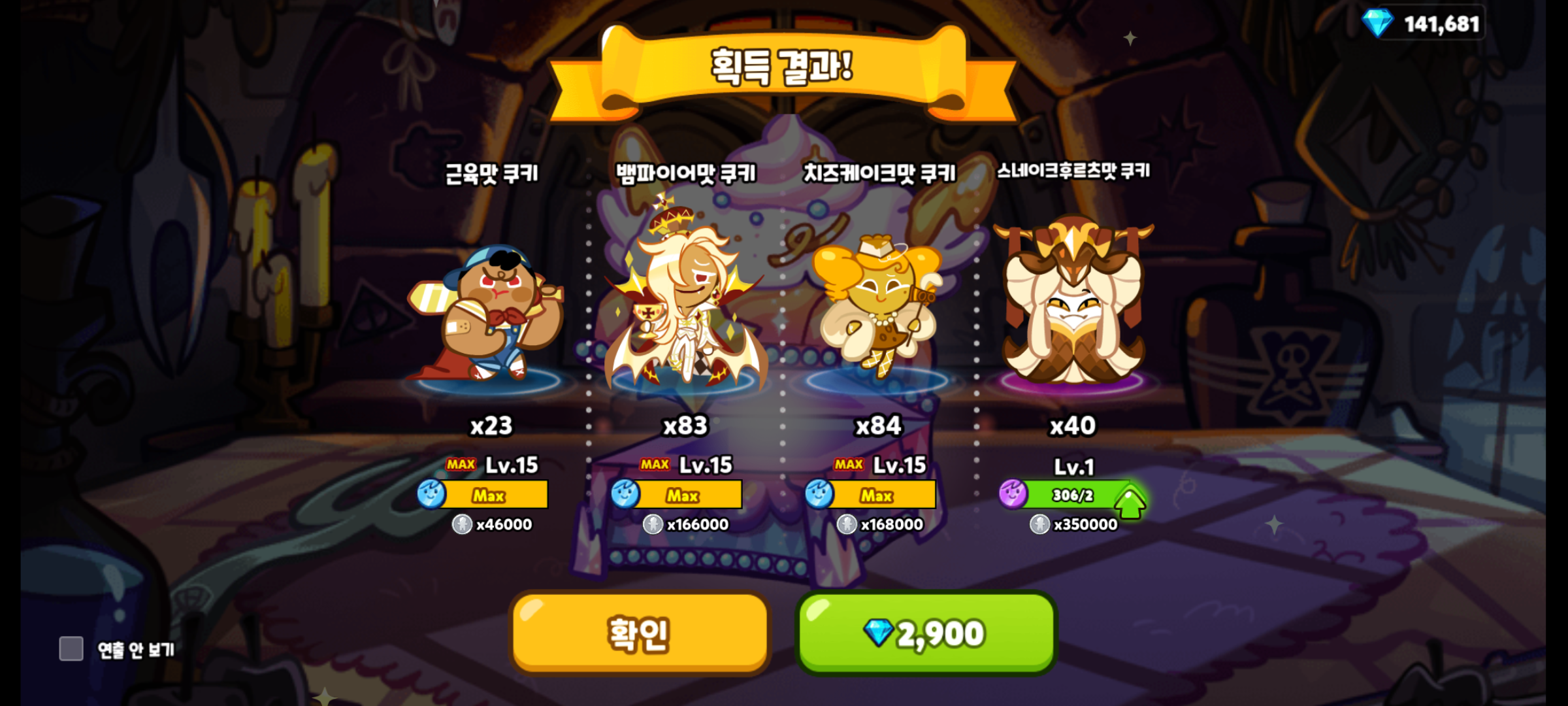 신규 쿠키, 펫, 보물을 획득하였습니다. 스네이크후르츠맛 쿠키는 스페셜 쿠키 상자에서 획득하였고, 비늘부채 펫은 고급 펫 알에서 획득하였고, 어린 용의 발톱 보물은 스페셜 보물 뽑기에서 획득하였습니다.