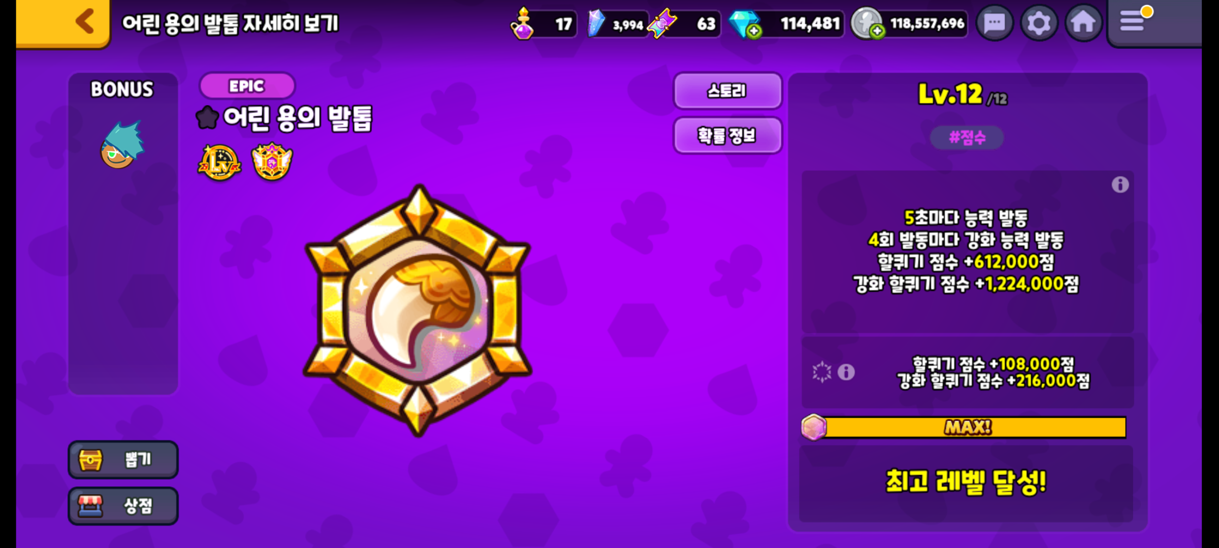 이렇게 세 가지를 모두 만렙 찍었습니다. 보물은 이미 만렙인 보물도 등장을 하여 쿠키, 펫보다는 만렙 찍기가 어려웠습니다. 레전더리 보물이라는 개념이 생겨서 함부로 마일리지를 쓸 수도 없어서 크리스탈만 사용하였습니다.